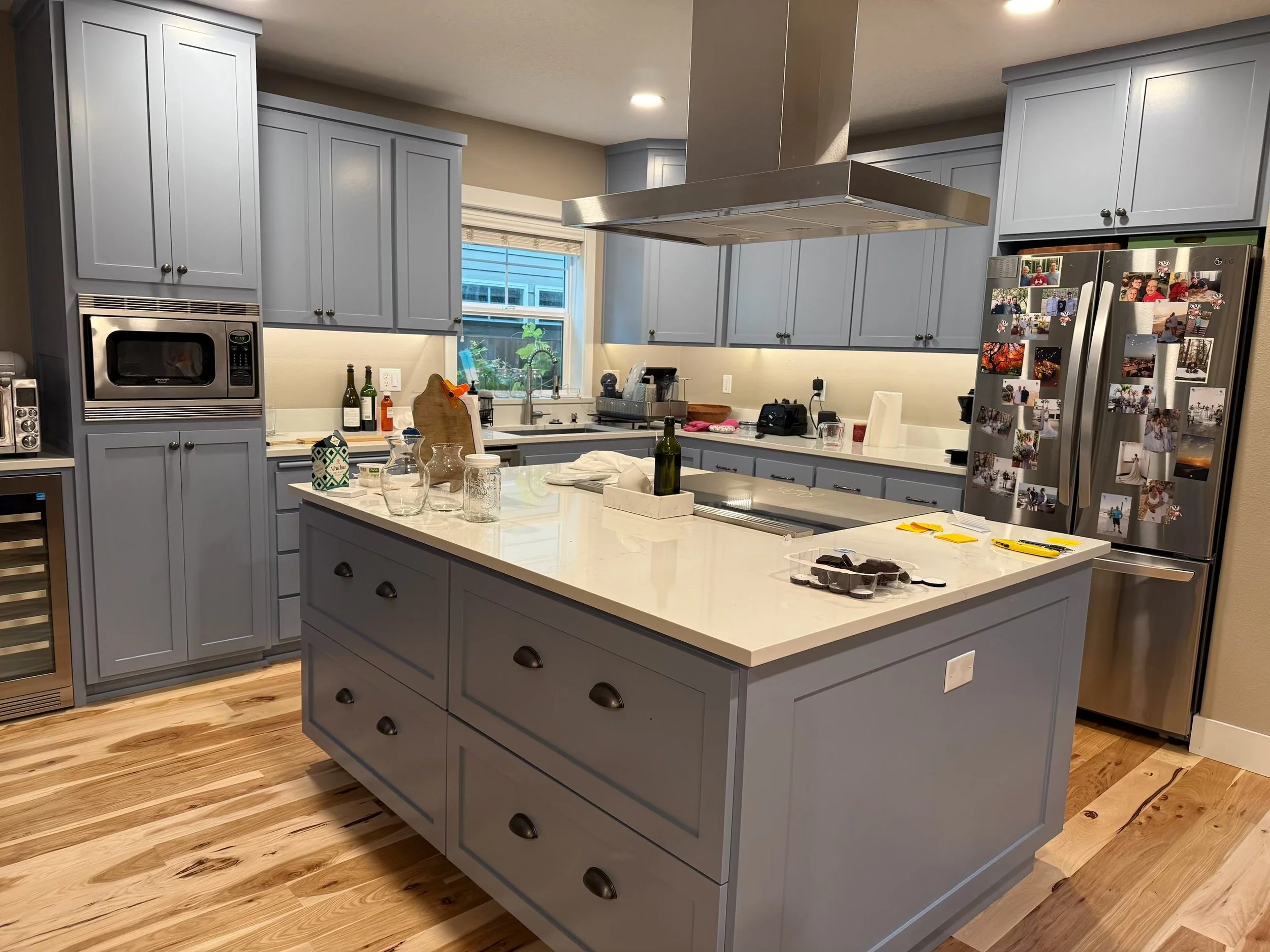 The countertops will be experienced by you and your house guests as part of an assemblage of materials, textures, and colors, so it’s critical to understand the interplay between materials. In the left example, we assess wood options that pair well with carerra marble. In the right example, Rory recommended these 3 blue cabinet colors as pairing well with the 3 quartz options the client was focused on. We also carefully considered selections for flooring, wall, color and window blinds.